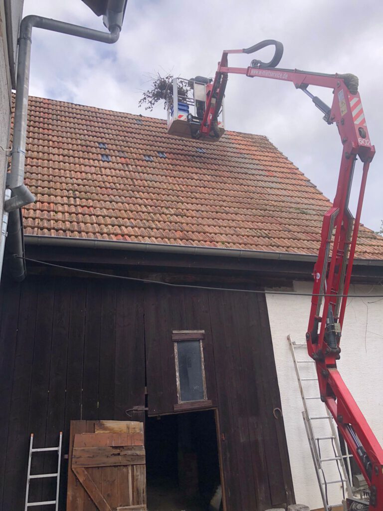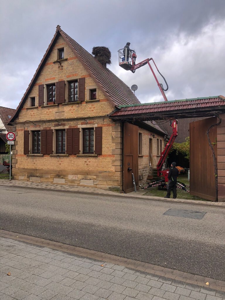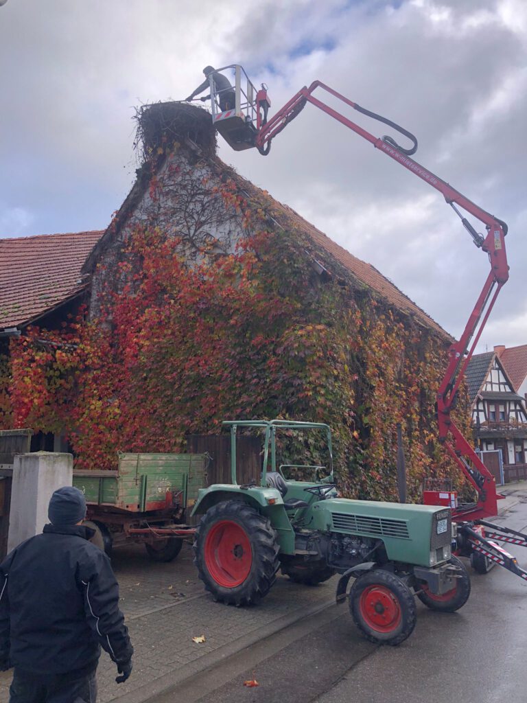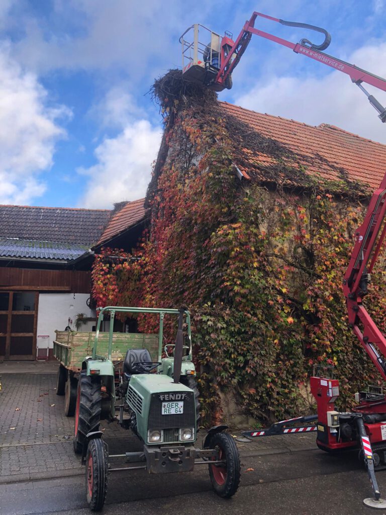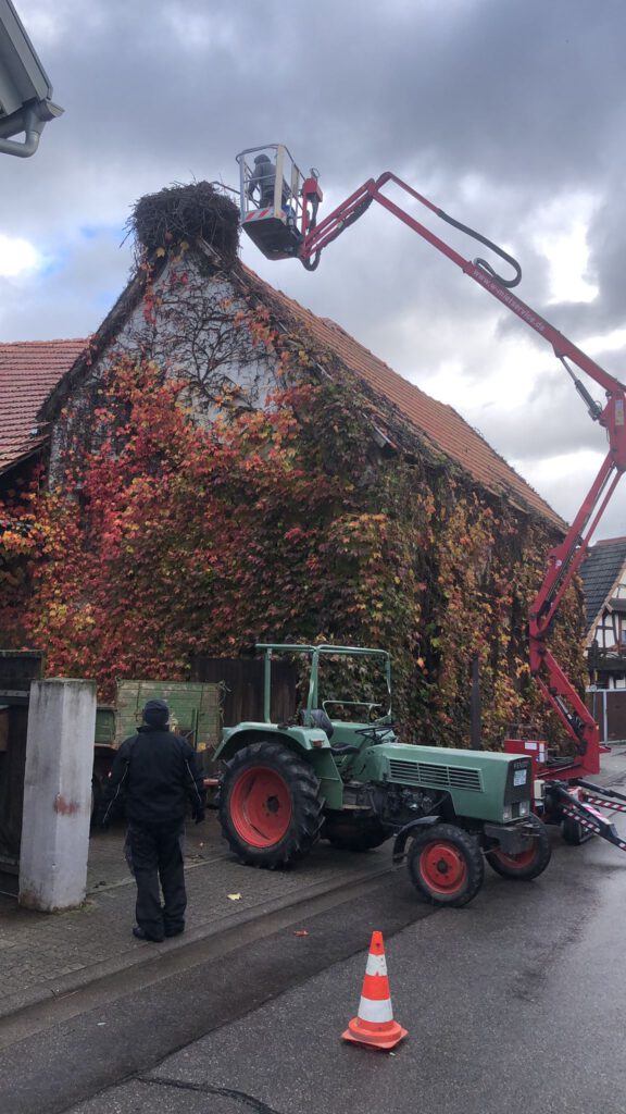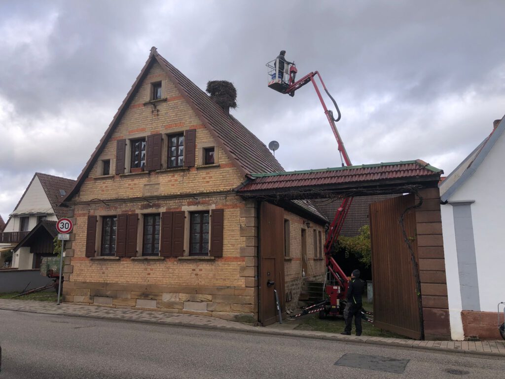 Start war 09:00 mit Abräumen eines begonnenen Nestbaus in der Hauptstraße. Beim zweiten Nest in der Raiffeisenstr. 12, wurde Nest, Dach und die Kehle gereinigt. Weiter ging es zur Hauptstraße 77 – hier sollte das Nest weiter gesichert und leicht zurückgebaut werden. Leider war es bei maximal ausgefahrenem Hubsteiger nicht möglich an das Nest zu kommen und wir mussten abbrechen. Christian Reis wird im Nov./Dez. mit einem größeren Hubsteiger erneut nach Winden kommen und das Nest bearbeiten.