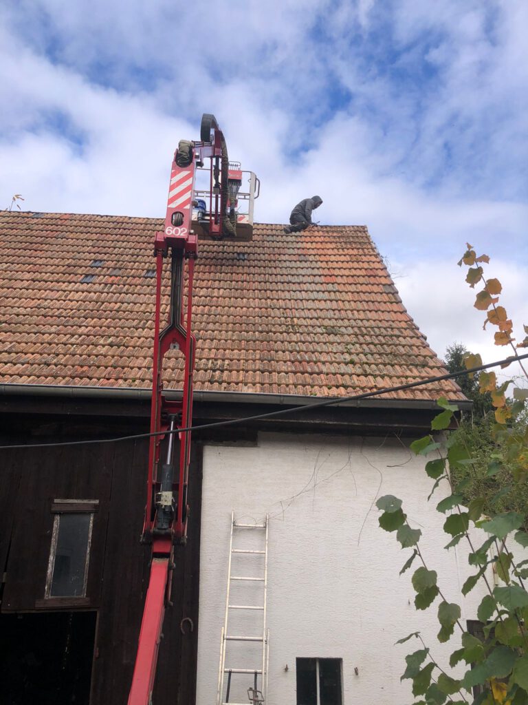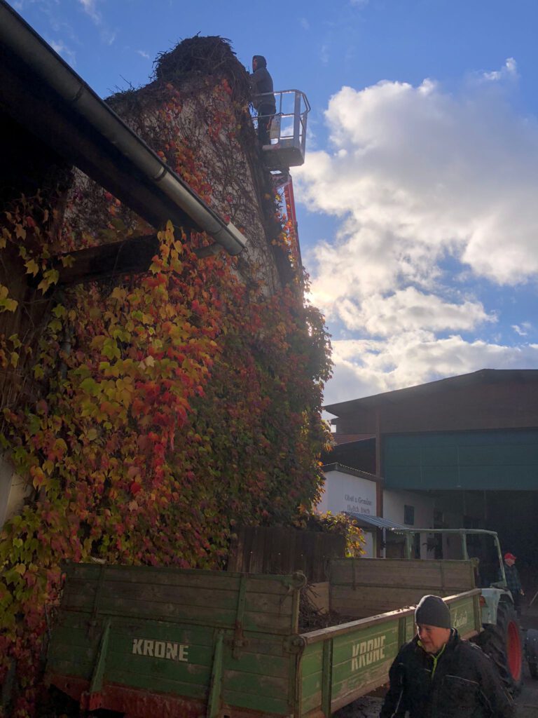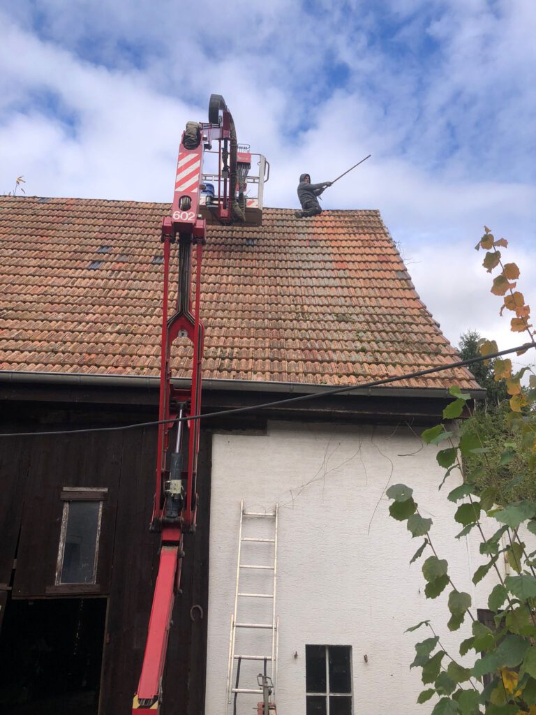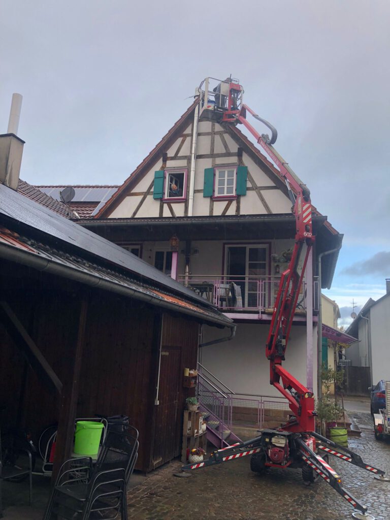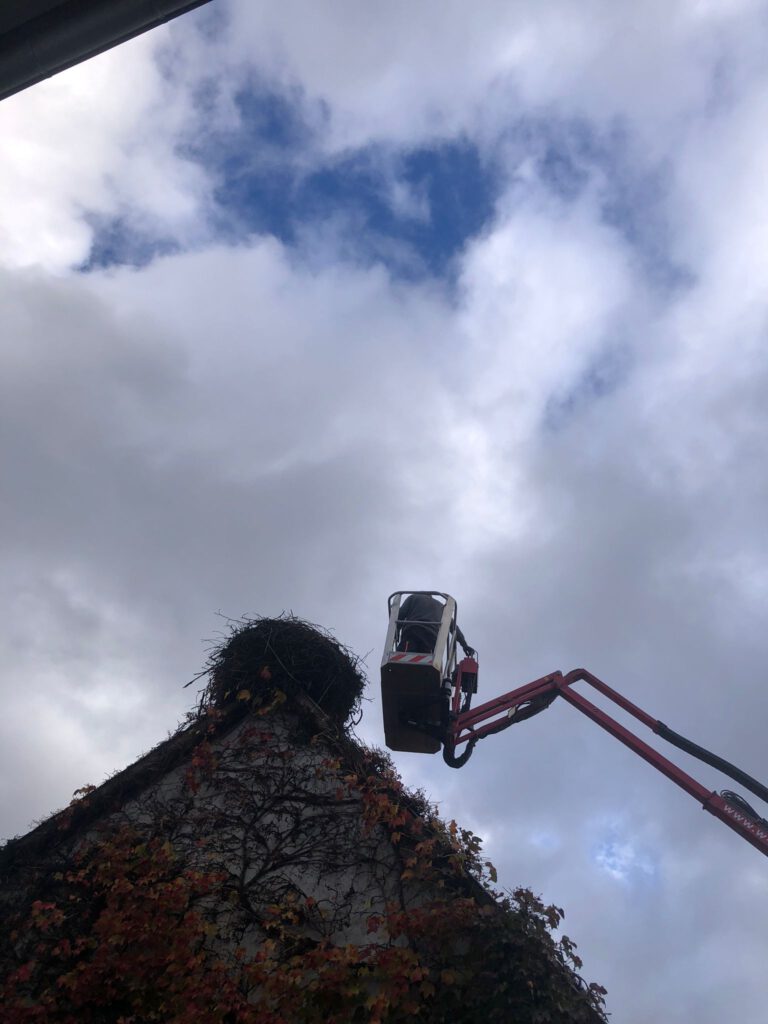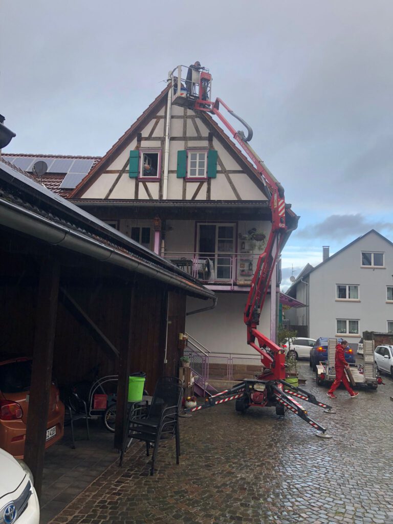 Start war 09:00 mit Abräumen eines begonnenen Nestbaus in der Hauptstraße. Beim zweiten Nest in der Raiffeisenstr. 12, wurde Nest, Dach und die Kehle gereinigt. Weiter ging es zur Hauptstraße 77 – hier sollte das Nest weiter gesichert und leicht zurückgebaut werden. Leider war es bei maximal ausgefahrenem Hubsteiger nicht möglich an das Nest zu kommen und wir mussten abbrechen. Christian Reis wird im Nov./Dez. mit einem größeren Hubsteiger erneut nach Winden kommen und das Nest bearbeiten.